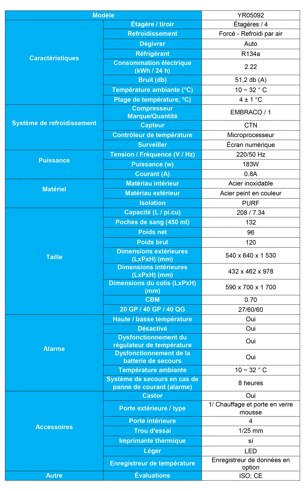 Les réfrigérateurs de banque de sang sont disponibles en différents types et configurations pour répondre à des besoins spécifiques. Le modèle YR05092 est disponible avec plusieurs options de capacité, offrant une flexibilité pour les petits comme pour les grands volumes de stockage. En comparaison, le modèle HXC-106 offre une capacité unique de 106 litres, pourrait être limité pour les hôpitaux qui nécessitent une plus grande capacité de stockage.