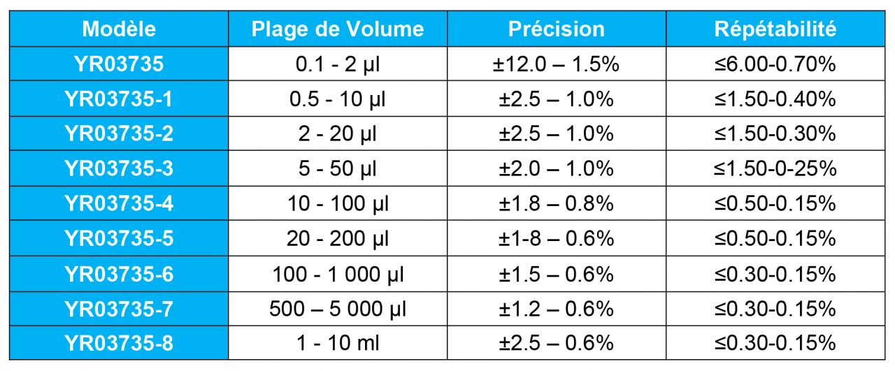 Caractéristiques de la Pipettes